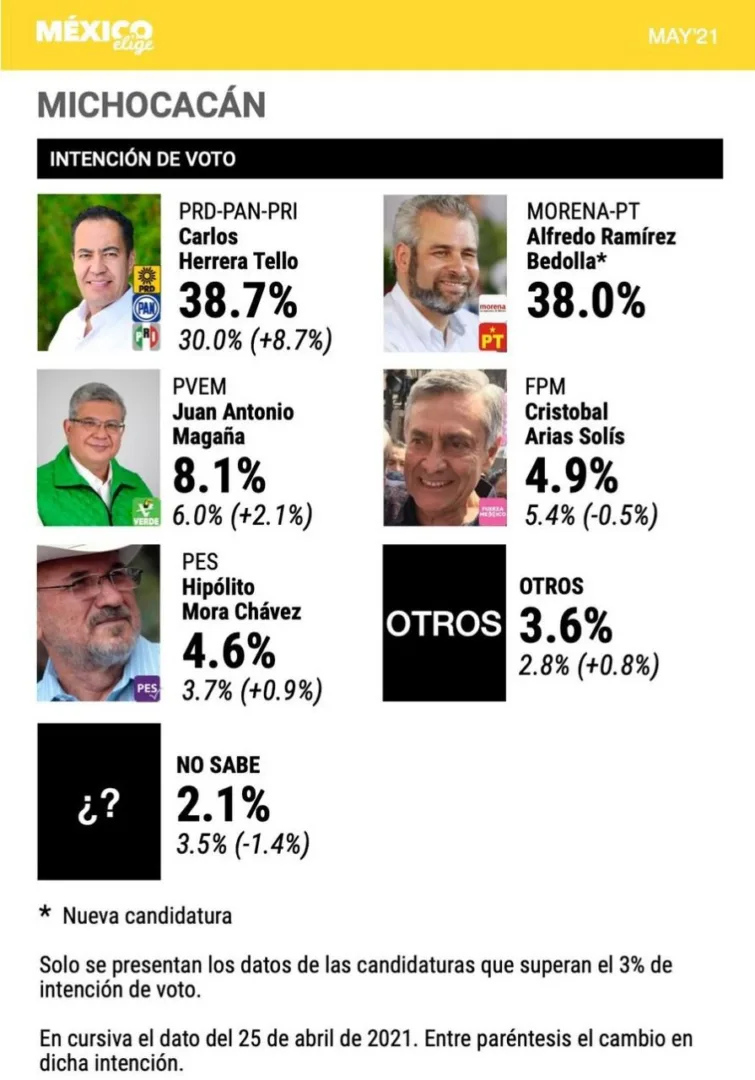 Morelia, Michoacán, a 19 de mayo de 2021.-En Michoacán, la intención de voto la encabeza Carlos Herrera Tello, el candidato del Equipo por Michoacán con 38.7%, de acuerdo a datos revelados por México Elige.
