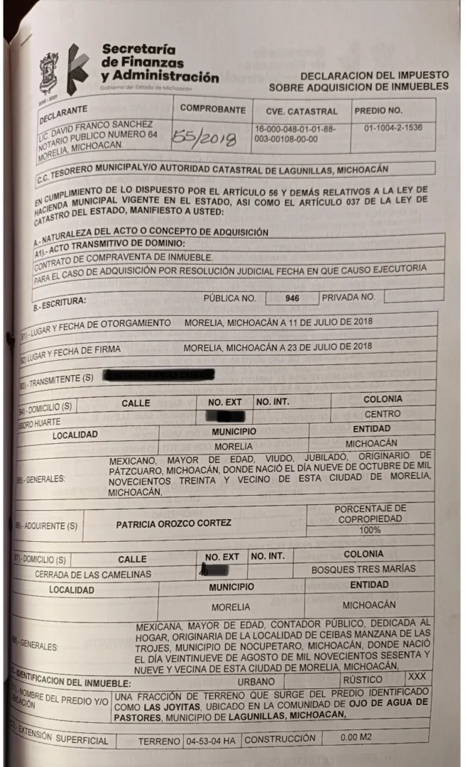 De acuerdo al documento, al momento de la compra del terreno, Patricia Orozco establece como domicilio particular una casa en el fraccionamiento de Bosques Tres Marías, cuyo propietario es Miguel Ángel Aguirre Abellaneda, actual Auditor Superior de Michoacán.