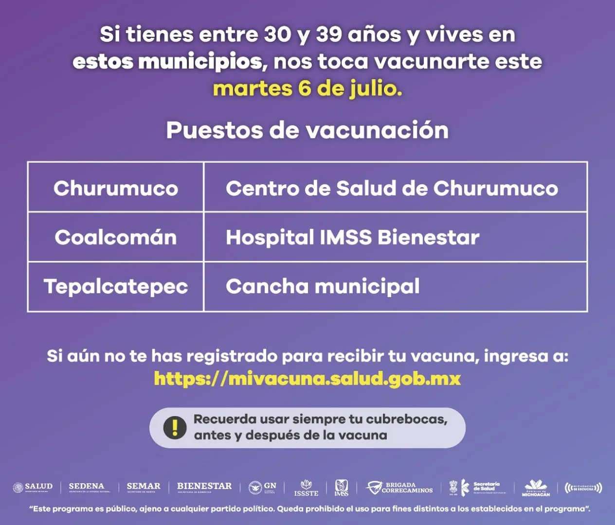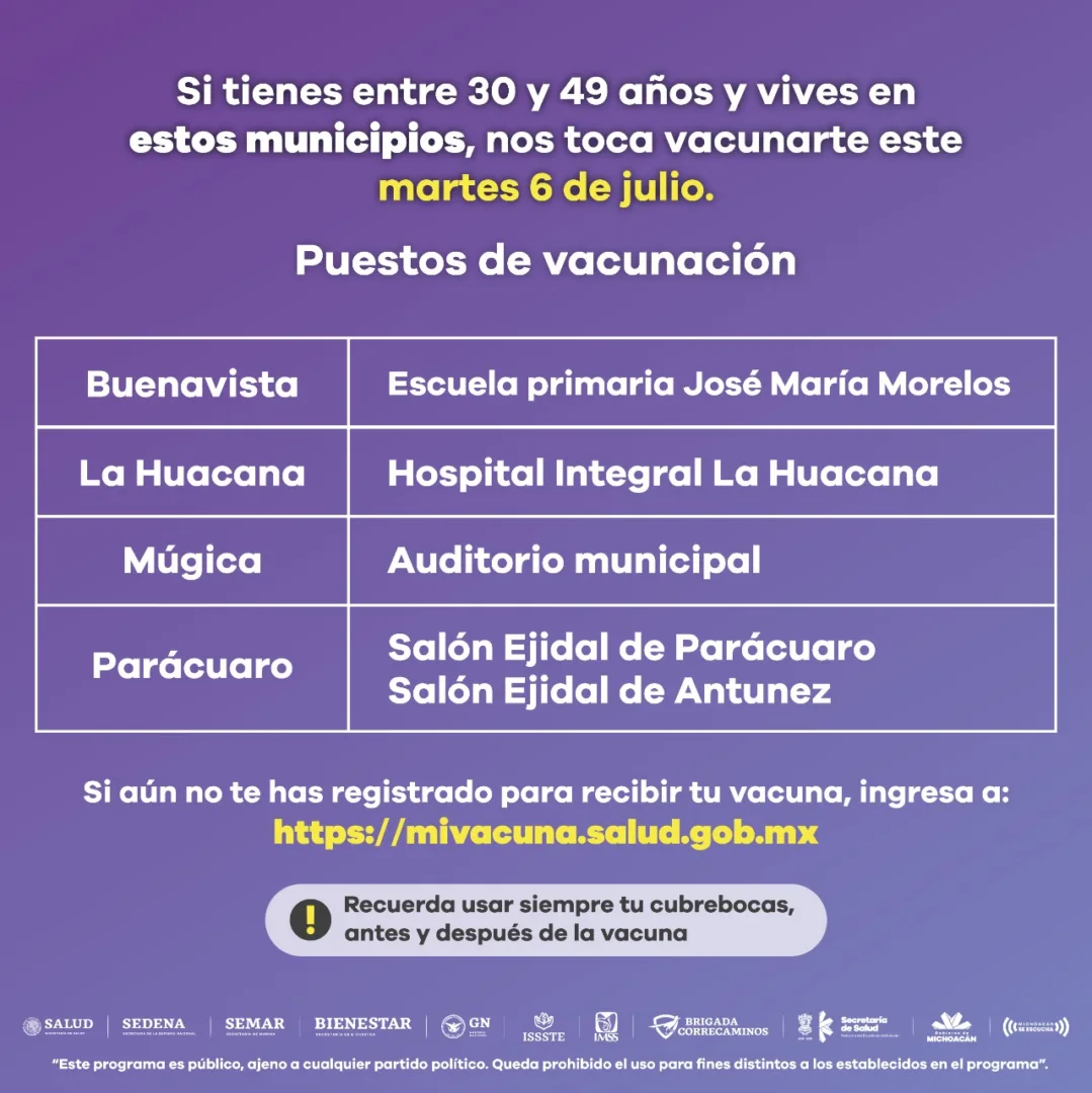 En Churumuco, Coalcomán y Tepalcatepec, se estará inmunizando a población de 30 a 39 años de edad; en Buenavista, La Huacana, Múgica y Parácuaro a los grupos de 30 a 39 y 40 a 49 años.