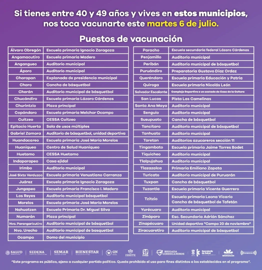 Así como, Paracho, Penjamillo, Peribán, Puruándiro, Queréndaro, Quiroga, Salvador Escalante, San Lucas, Santa Ana Maya, Senguio, Susupuato, Tancítaro, Tanhuato, Taretan, Tingambato, Tiquicheo, Tlalpujahua, Tlazazalca, Turicato, Tuxpan, Tuzantla, Tzitzio, Yurécuaro, Zináparo, Zinapécuaro y Ziracuaretiro se estará vacunando a población de 40 a 49 años.