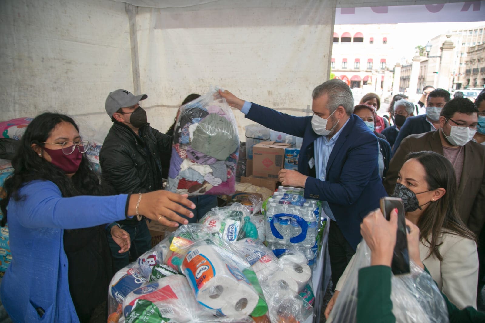 Morelia, 30 de agosto del 2021.- El gobernador electo Alfredo Ramírez Bedolla y su esposa Grisel Tello Pimentel pusieron en marcha la jornada de solidaridad con damnificados por el huracán Nora y la contingencia climática en Michoacán, a la que se han sumado legisladores, empresarios y organizaciones sociales.