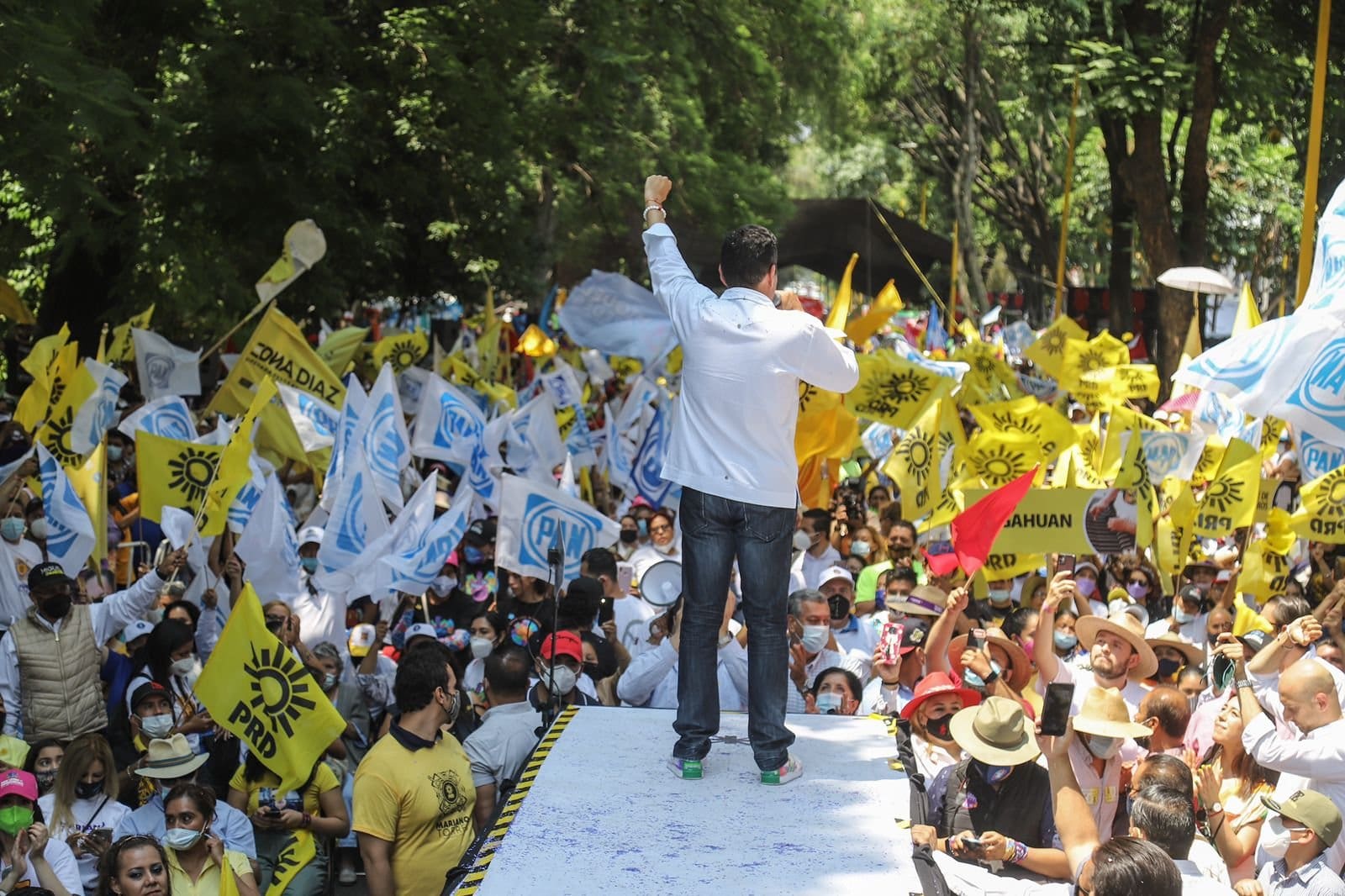 “Viendo a toda la gente reunida con la potencia y fortaleza del PRI, la dignidad y el humanismo del PAN, y el empuje y la defensa de las causas sociales del PRD, con esa claridad le decimos al equipo marrón que no los queremos y les decimos que vamos a ganar las próximas elecciones”, expresó el candidato ante el festivo entusiasmo de las multitudes congregadas.