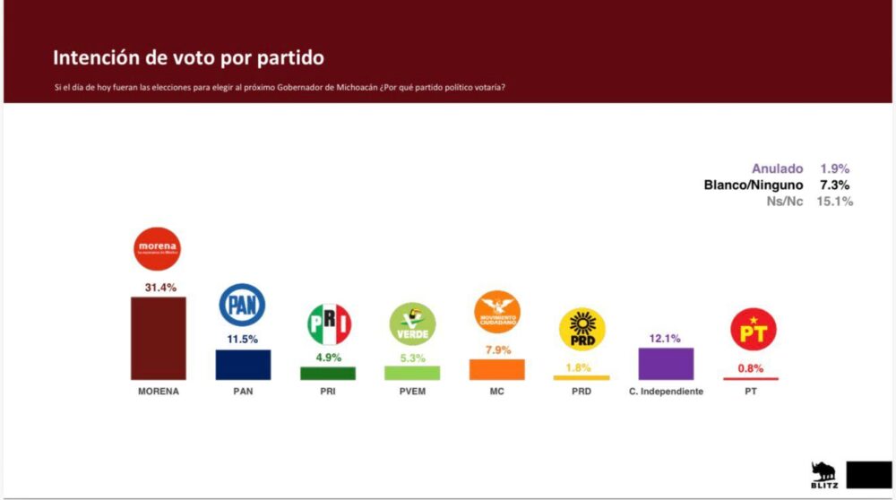 MORELIA, Michoacán. – El partido Morena se sitúa como la primera fuerza política en Michoacán de cara a los próximos comicios para la gubernatura, con el 31.4% de la intención de voto, según los resultados de la encuesta estatal realizada por la consultora Blitz entre el 7 y el 17 de diciembre de 2025.