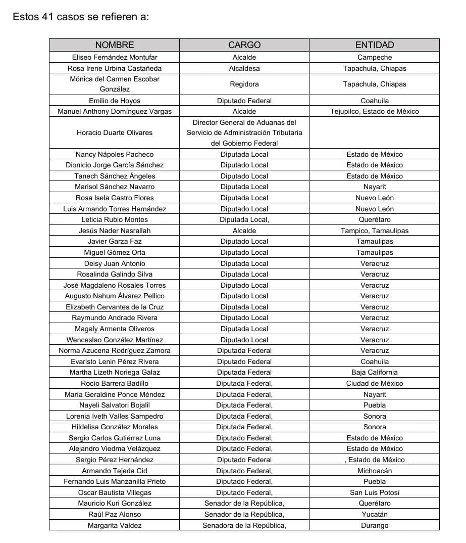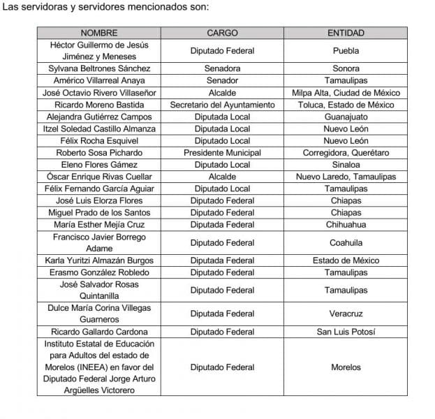 Los hechos incluyen a servidoras y servidores de todos los partidos políticos nacionales y de dos partidos políticos locales de entidades como Campeche, Chiapas, Ciudad de México, Coahuila, Estado de México, Guanajuato, Nayarit, Nuevo León, Querétaro, Quintana Roo, San Luis Potosí, Sinaloa, Tamaulipas, Tlaxcala y Veracruz.