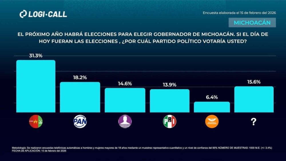En cuanto a la intención de voto por partidos y coaliciones, el estudio de Logi-Call sitúa a la alianza conformada por Morena, PT y PVEM con un 31.3%. Por su parte, el PAN registra un 18.2%, el PRI un 13.9% y Movimiento Ciudadano un 6.4%.