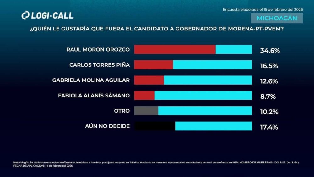 La encuestadora Logi-Call presentó su estudio correspondiente al mes de febrero sobre la definición del Coordinador Estatal de Defensa de la Cuarta Transformación en Michoacán. Los resultados indican que el senador Raúl Morón Orozco se posiciona en el primer lugar de las preferencias internas con un 34.6%.