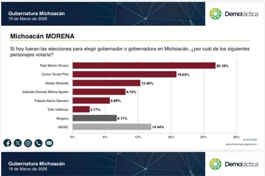 De acuerdo con los resultados de la más reciente encuesta realizada por la firma Demotáctica, el senador Raúl Morón Orozco encabeza la intención de voto entre los aspirantes de Morena a la candidatura por Michoacán, al registrar un 26.18% de las preferencias. El estudio estadístico sitúa al legislador con una diferencia de 7.15 puntos porcentuales respecto al segundo lugar.