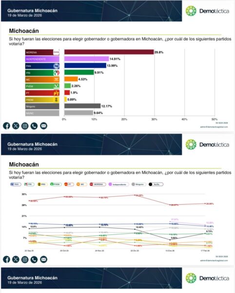 En cuanto a la preferencia por partidos políticos, la encuesta de Demotáctica indica que Morena mantiene una ventaja competitiva con el 29.8% de la intención de voto a nivel estatal. Por su parte, el Partido Acción Nacional (PAN) se sitúa en la segunda posición con un 13.99% de las preferencias, seguido por el resto de las fuerzas políticas de la entidad.
