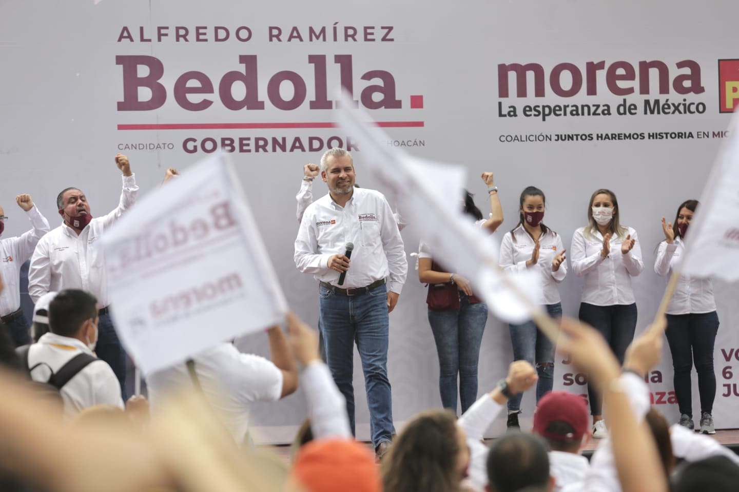 Cotija de la Paz, Michoacán a 14 de mayo de 2021.- “El abandono de Michoacán por parte de Silvano Aureoles es evidente cuando viajamos por las carreteras destrozadas de todas las regiones del estado, porque con la desaparición de la Junta Local de Caminos ,(JLC,) que impulsó el gobernador no hay quién les de mantenimiento; hay novecientos trabajadores despedidos y maquinaria detenida”, señaló Alfredo Ramírez Bedolla, candidato de Morena-PT a la gubernatura.