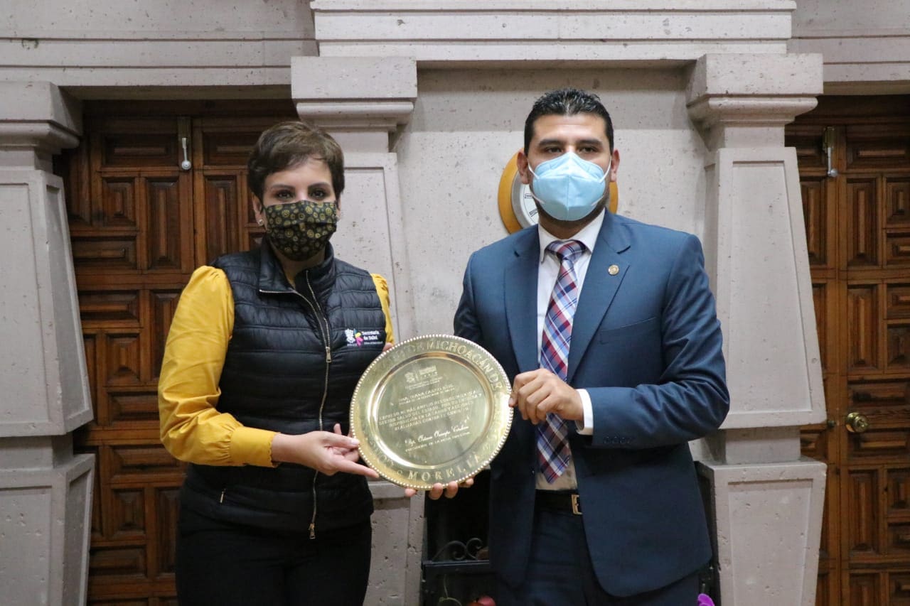 El presidente del Congreso del Estado, Octavio Ocampo Córdova hizo entrega de un reconocimiento a la titular de la Secretaría de Salud en Michoacán, Diana Carpio Ríos y al personal del sector salud por su ardua labor, compromiso y profesionalismo frente al Covid-19.