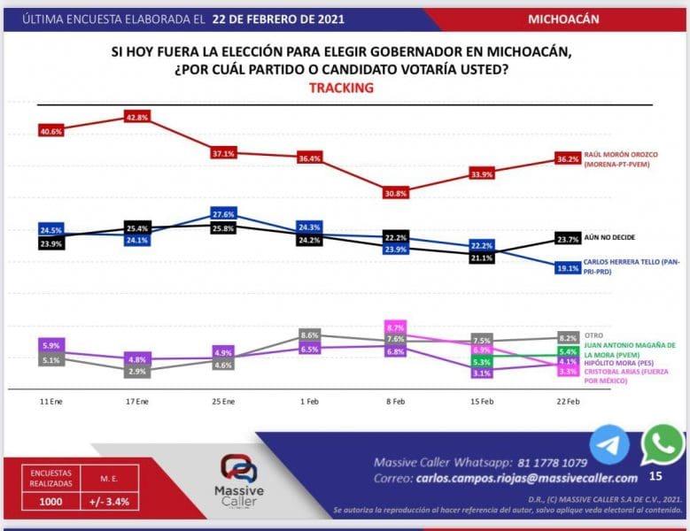 Con base en información de la encuestadora Massive Caller, Raúl Morón presenta un notorio incremento en preferencias las electorales, con respecto al último estudio de opinión realizado el pasado 15 de febrero, cuando el 33.9 por ciento de los ciudadanos encuestados se pronunció a favor de que el presidente de Morelia con licencia tome las riendas de la gubernatura.