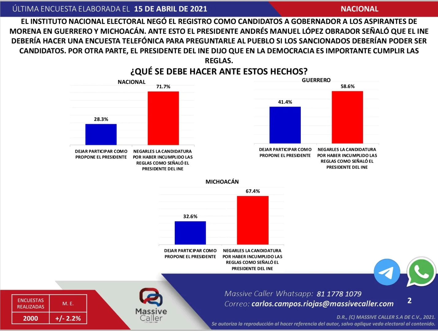 De acuerdo a esta encuesta realizada el 15 de abril, la ciudadanía contesto a nivel nacional que, se les niegue la candidatura por haber incumplido las reglas como lo señalo el presidente del INE, así respondió el 71.7 por ciento de la población, mientras que el 28.3 por ciento mencionó que se debe dejar participar como propone el presidente.