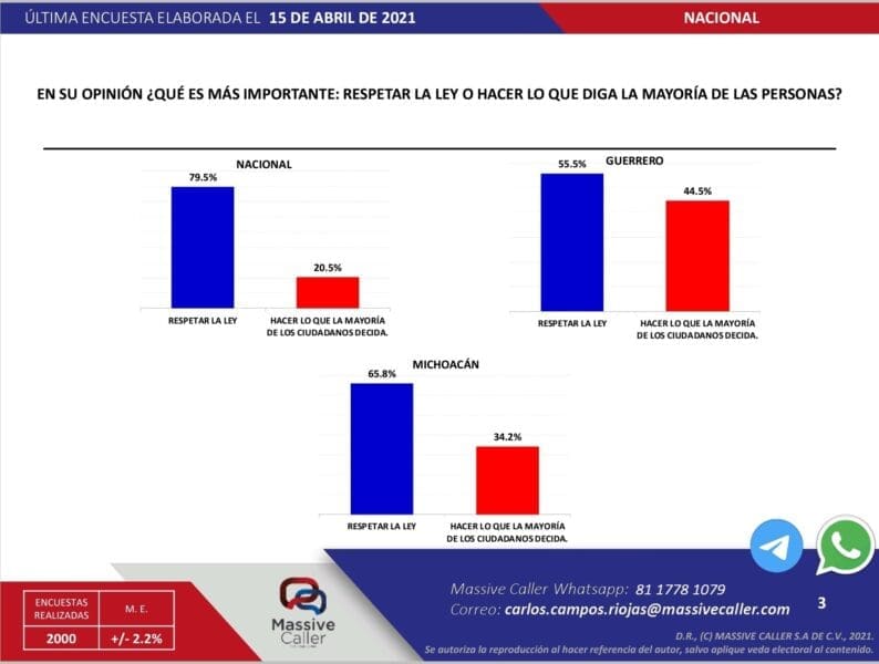 En Michoacán el 65.8 por ciento, voto por respetar la ley y el 34.2 por ciento, voto por hacer lo que la mayoría diga; en Guerrero el 55.5 por ciento pidió respetar la ley y el 44.5 por ciento dijo que hacer lo que la mayoría decida; cabe mencionar que la metodología para esta encuesta fue vía telefónica, dirigida a hombres y mujeres mayores de 18 años, con un tipo de muestreo representativo-cuantitativo.