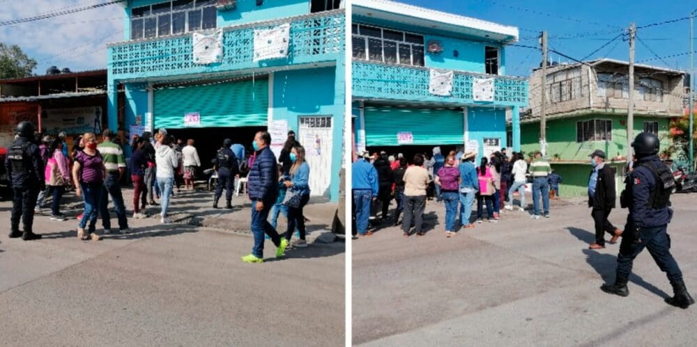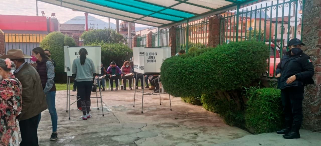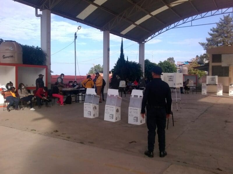Aunado a lo anterior, los elementos de la Policía Municipal verifican que en cada una de las casillas se cumplan las medidas sanitarias para evitar contagios por COVID-19, uso obligatorio del cubrebocas, respeto a la sana distancia y aplicación del gel antibacterial.