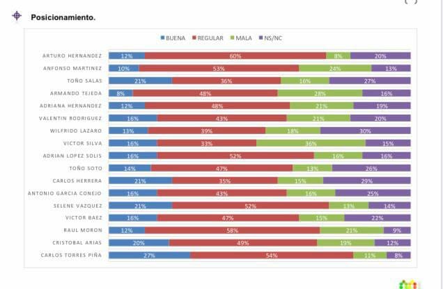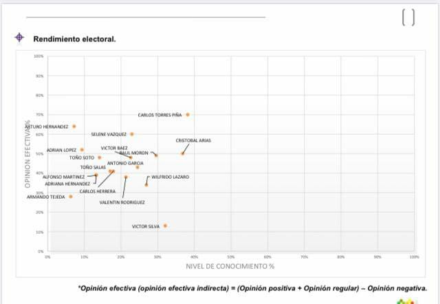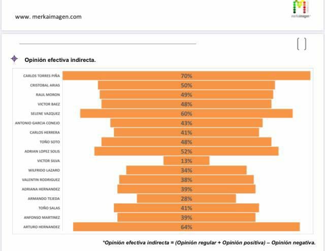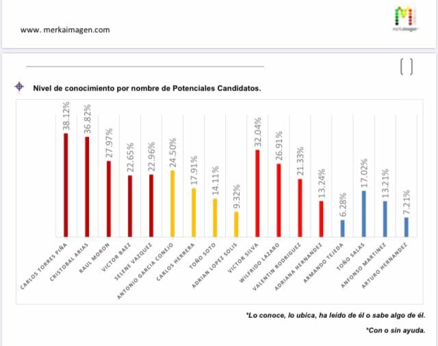 La encuesta inicio el pasado 15 de noviembre y culmino el 17 de noviembre, con un coeficiente de confianza del 95 por ciento y un margen de error de -2.5 por ciento, según el nivel de conocimiento por nombre de potenciales candidatos, se muestra a Carlos Torres Piña como la persona que encabeza esta encuesta con un 38.12 por ciento, seguido de Cristóbal Arias con un 36.82 por ciento, Raúl Morón con un 27.97 por ciento, Víctor Báez con 22.65 por ciento y Selene Vázquez con 22.96 por ciento.