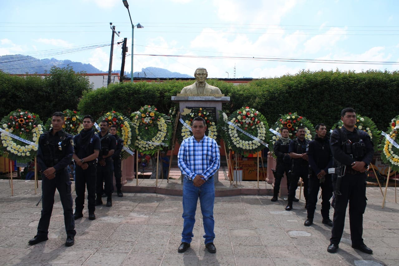 Ocampo,Mich. El H. Ayuntamiento qje encabeza el presidente municipal Amado Gómez en compañía de cuerpo de cabildo, secretario del ayuntamiento y autoridades auxiliares realizaron un acto Conmemorativo por el CLXI Aniversario Luctuoso de Melchor Ocampo.
