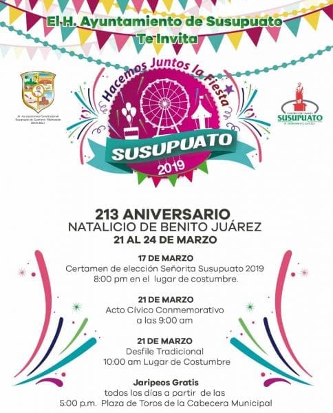 Indicó que Estas fiestas se realizan con motivo del aniversario del natalicio del Benemérito de las Américas, Don Benito Juárez García y que las actividades inician el 17 de marzo con la elección de la reina de Susupuato 2019.