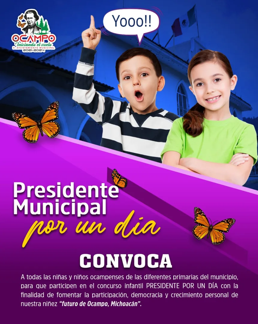 A todas las niñas y niños ocampenses de las diferentes primarias del municipio, para que participen en el concurso infantil “PRESIDENTE MUNICIPAL POR UN DÍA”, con la finalidad de fomentar la participación, la democracia y el crecimiento personal de nuestra niñez “futuro de Ocampo, Michoacán”.