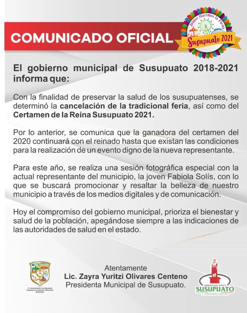 Susupuato, Michoacán. Con la finalidad de preservar la salud de los susupuatenses, el gobierno municipal que preside la edil Zayra Olivares Centeno determinó la cancelación de la tradicional feria, así como del Certamen de la Reina Susupuato 2021.