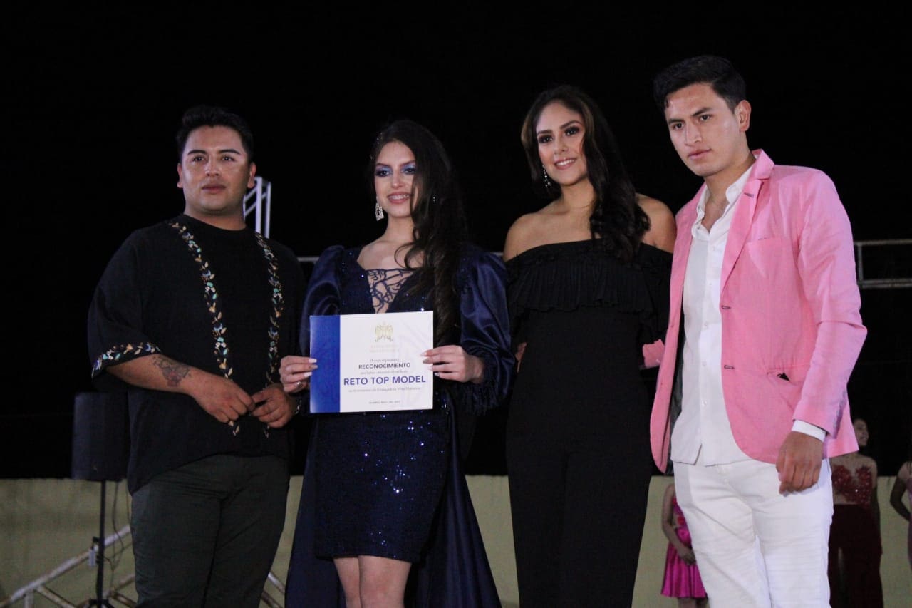Luisa María Estrada Gómez, missologa y primer Embajadora de la Mariposa Monarca, en compañía de los jóvenes iniciadores del certamen, entregaron el diploma a la ganadora del reto top model de esta noche.