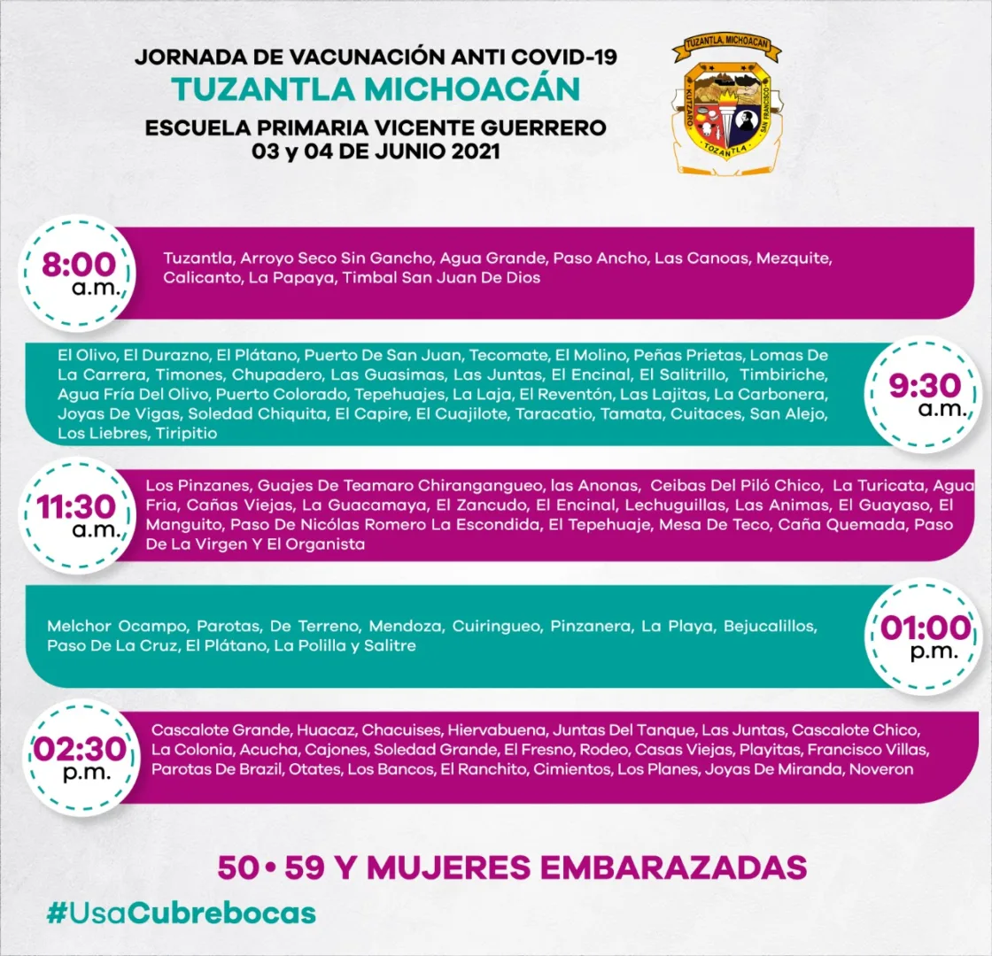 El gobierno municipal de Tuzantla informa que, está confirmada la aplicación de la vacuna contra el COVID-19 para el día de mañana jueves 3 de junio, en los horarios ya anunciados.