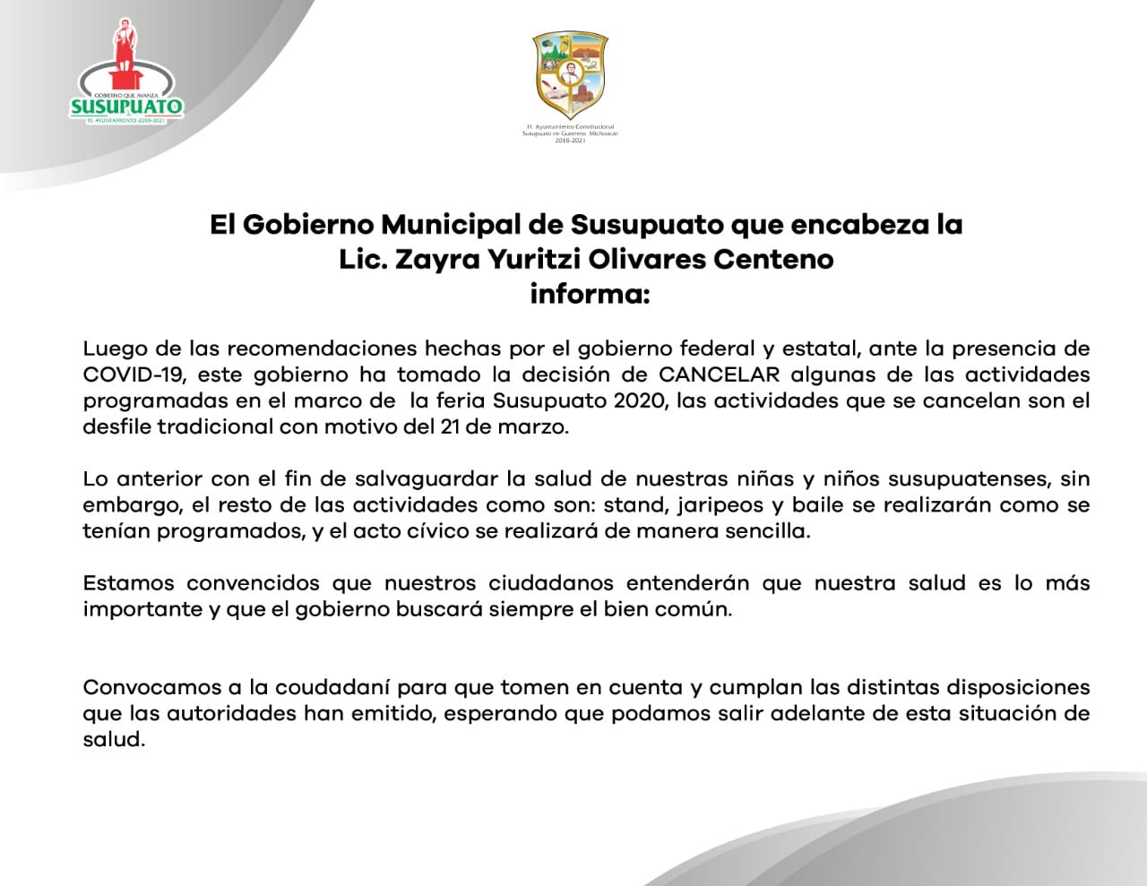 Luego de las recomendaciones hechas por el gobierno federal y estatal, ante la presencia de COVID-19, este gobierno ha tomado la decisión de CANCELAR algunas de las actividades programadas en el marco de la feria Susupuato 2020, las actividades que se cancelan son el desfile tradicional con motivo del 21 de marzo.