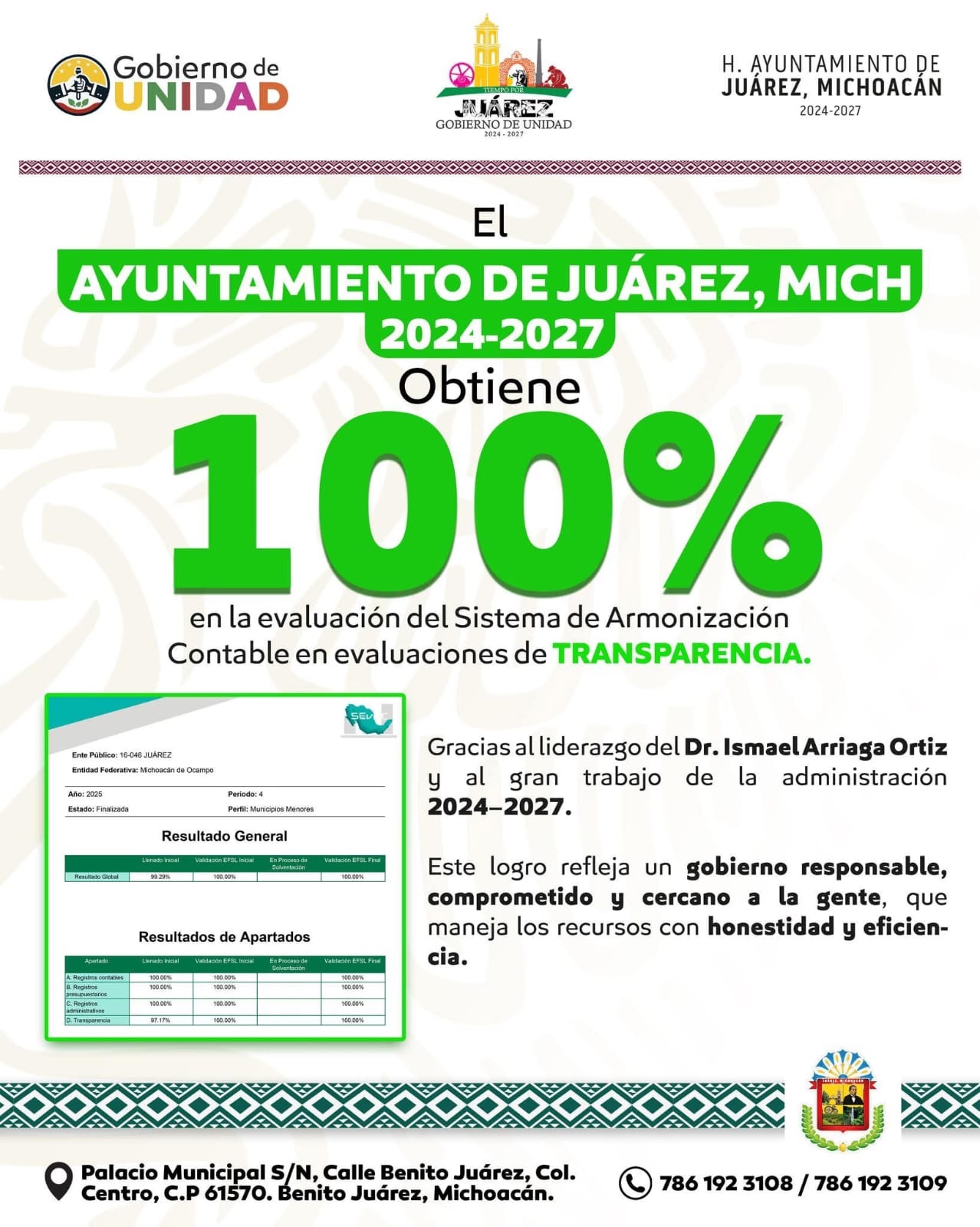 El presidente municipal de Juárez, Dr. Ismael Arriaga Ortiz, informó que el Ayuntamiento obtuvo una calificación de 100% en la evaluación del Sistema de Evaluación de la Armonización Contable (SEvAC) correspondiente al ejercicio 2025.