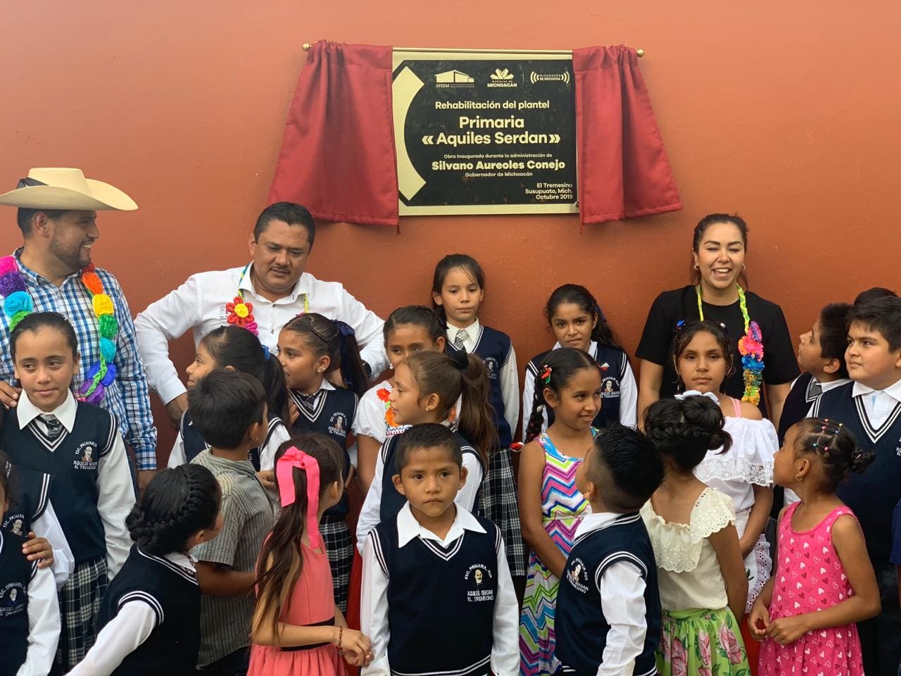 Susupuato, Michoacán. Acompañada por Padres de Familia, Alumnos personal Docente y Directivo, La Presidente Municipal Lic. Zayra Olivares Centeno hizo la Develacion de la Placa y corte de listón de la Rehabilitación total de la Escuela Primaria “Aquiles Serdán” en la localidad de Tremesino.