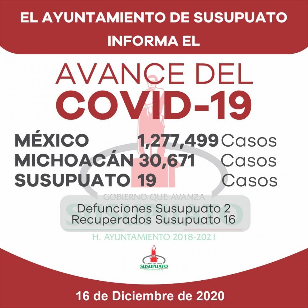 Con corte al 16 de diciembre de 2020, de acuerdo a lo informado por la autoridad en salud en el sitio https://michoacancoronavirus.com/nuevaconvivencia/ Susupuato presenta un caso nuevo por covid-19.
