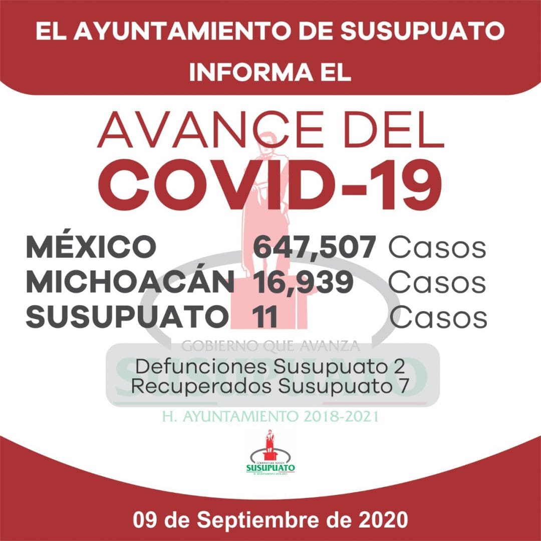 Con corte al 9 de septiembre de 2020, de acuerdo a lo informado por la autoridad en salud en el sitio https://michoacancoronavirus.com/nuevaconvivencia/ Susupuato presenta dos casos nuevos por covid-19.