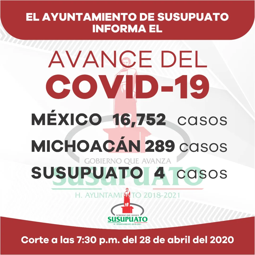 El gobierno municipal de Susupuato 2018-2021 que dirige la presidenta Zayra Olivares Centeno informa que, de acuerdo a la información emitida por el Comité Estatal de Seguridad en Salud , al corte de las 19:30 hrs., del 28 de abril de 2020, en Susupuato se confirma la cuarta persona positiva para COVID-19.