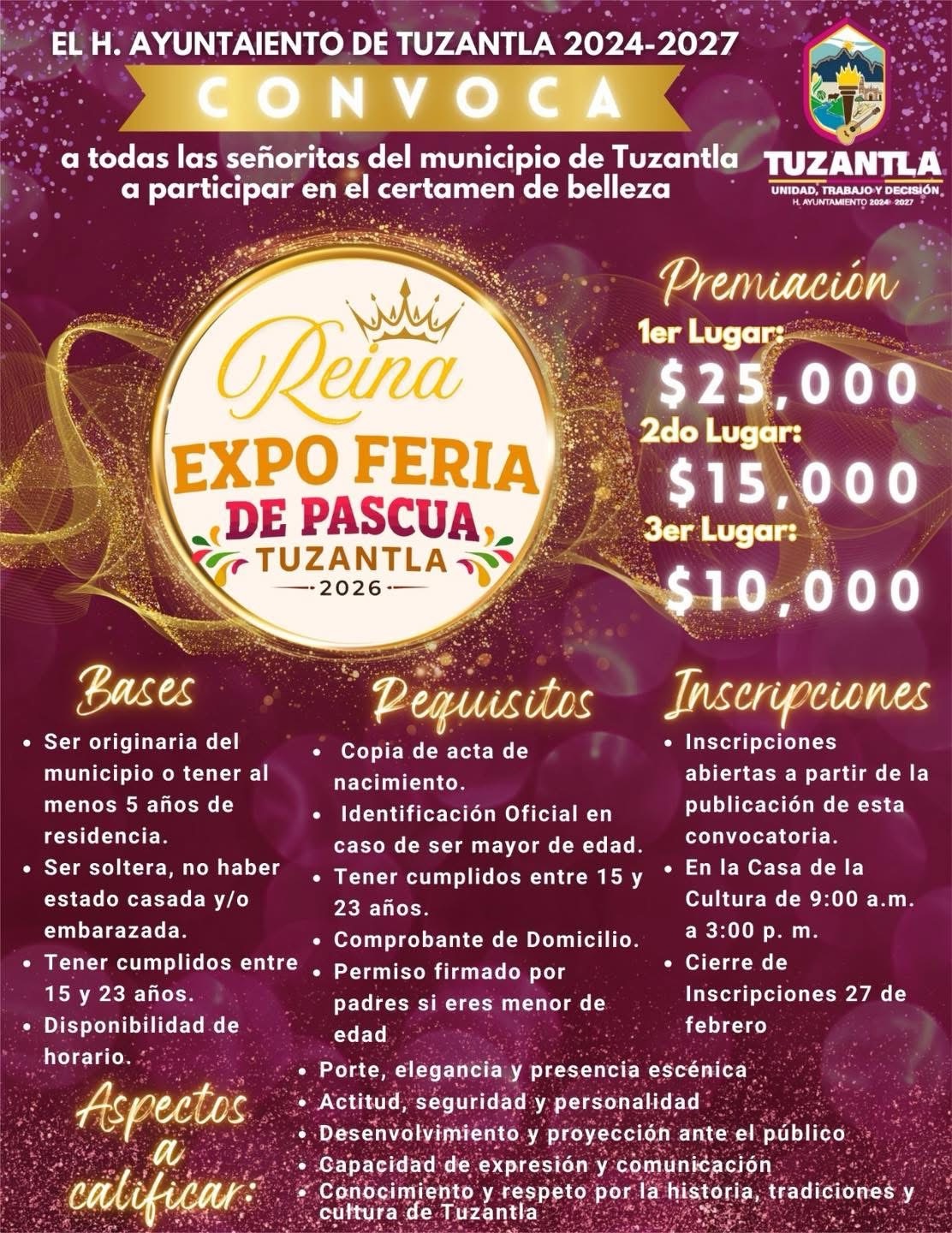 El Ayuntamiento de Tuzantla, bajo la presidencia municipal de Fernando Ocampo Mercado, lanzó oficialmente la convocatoria para el certamen de belleza que coronará a la Reina Expo Feria de Pascua Tuzantla 2026, una de las tradiciones más emblemáticas del municipio en el marco de su fiesta principal.