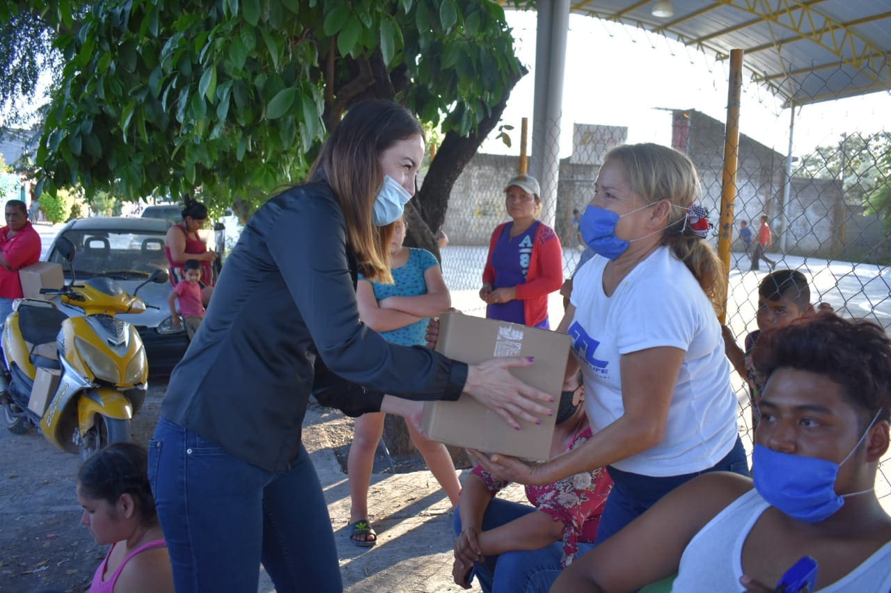 • La edil hizo entrega de apoyos alimentarios en las colonias Morelos I y II, además de informar sobre los avances de las obras que se realizan en beneficio de las comunidades.