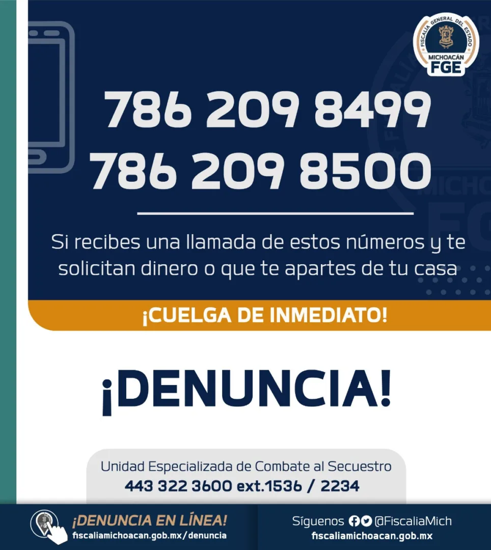 La FGE solicita a la población a no atender este tipo de llamadas y denunciarlas de forma inmediata ante la Fiscalía Regional más cercana, o bien, a la Unidad Especializada de Combate al Secuestro, ubicada en Periférico Independencia #5000, colonia Sentimientos de la Nación en Morelia, o comunicarse al teléfono 443 322 36 00 extensión 2234.