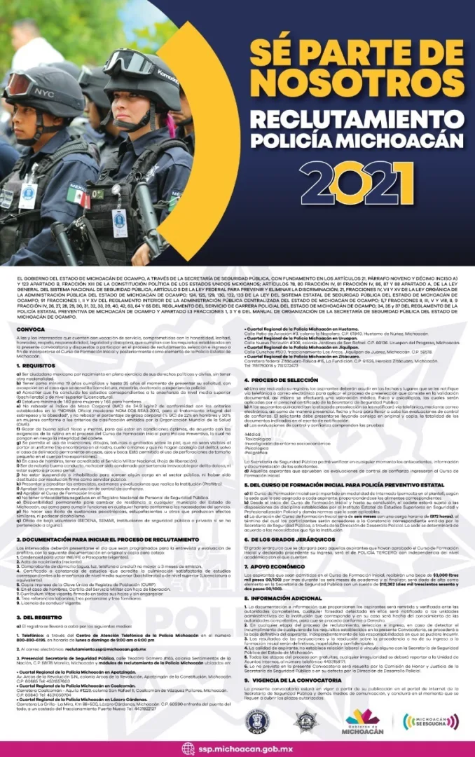La corporación de seguridad está en búsqueda de hombres y mujeres con vocación de servicio, honestidad, respeto, responsabilidad y disciplina, para velar por la seguridad de las y los michoacanos.