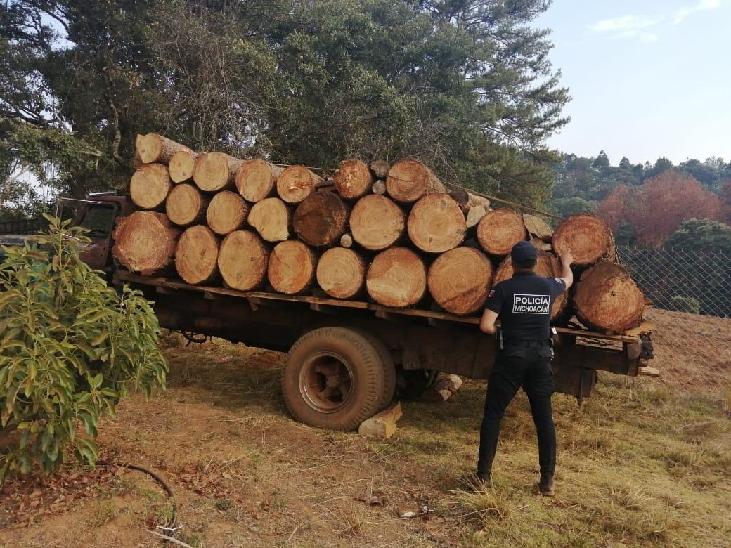 Acuitzio, Michoacán.- En atención a un reporte, elementos de la División Ambiental de la Secretaría de Seguridad Pública (SSP), aseguraron un automotor cargado con madera ilegal; hecho ocurrido en este municipio.