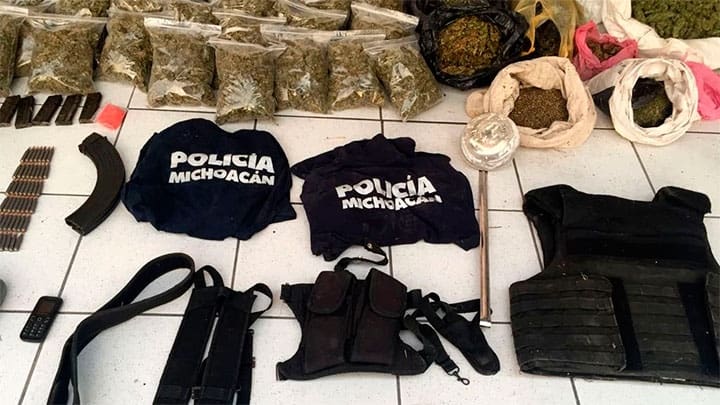 Además, fueron localizadas 48 bolsas de diferentes cantidades que contenían vegetal verde seco con las características de la marihuana, dos bolsas con semilla del mismo narcótico, una báscula gramera y un cucharon de acero inoxidable con residuos al parecer de droga, así como un chaleco balístico, un porta cargador doble, dos fornituras, dos playeras de color azul con la leyenda de una corporación policial, una lámpara de mano y un teléfono celular.