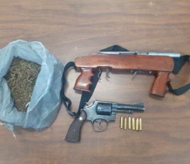 Derivado de ello, el personal policial realizó una inspección, localizando entre sus pertenencias dos armas de fuego calibre .38 super y .22 mm., respectivamente, así como seis cartuchos útiles y una bolsa que contenía la mencionada droga.