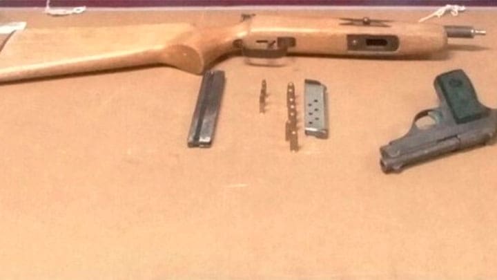 En el interior de la unidad, marca Dodge, color arena, fueron localizadas un arma corta, calibre .380 y una escopeta calibre 22.