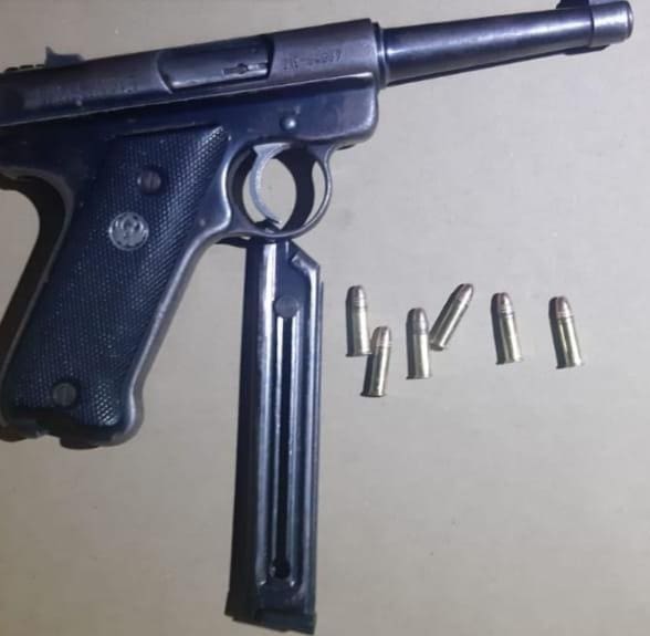 Al hacerle una inspección al ahora detenido, el personal policial localizó entre sus pertenencias el arma de fuego calibre .22 mm., un cargador y seis cartuchos útiles, procediendo a su aseguramiento.