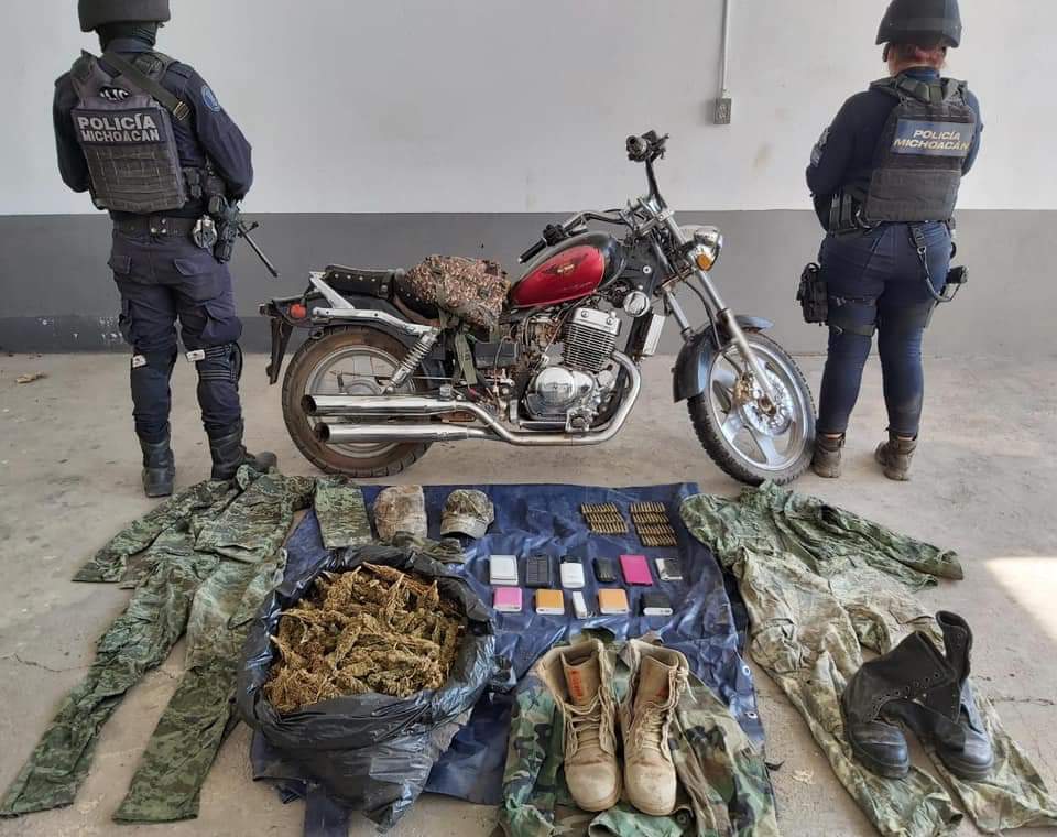Tiquicheo, Michoacán, a 14 de marzo de 2020.- Derivado de una acción operativa, agentes de la Secretaría de Seguridad Pública (SSP) aseguraron una bolsa con hierba verde seca al parecer marihuana de más de 3 kilos, cartuchos útiles, equipo táctico y una motocicleta con alteraciones en sus medios de identificación, en este municipio.