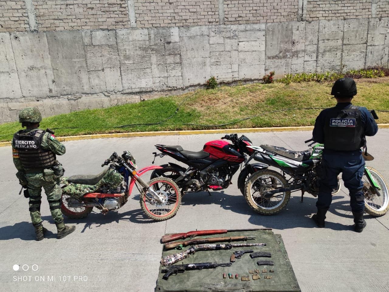 El despliegue de un dispositivo de seguridad en la localidad de Patambam, permitió a oficiales de la Policía Michoacán en conjunto con personal del Ejército Mexicano y de la GN, localizar 4 fusiles y un arma corta de diferentes calibres, 2 cargadores, 35 cartuchos útiles, así como 3 motocicletas de las marcas Italika, y Bajaj, respectivamente, mismas que al ser inspeccionadas, se corroboró que contaban con alteraciones en sus medios de identificación.