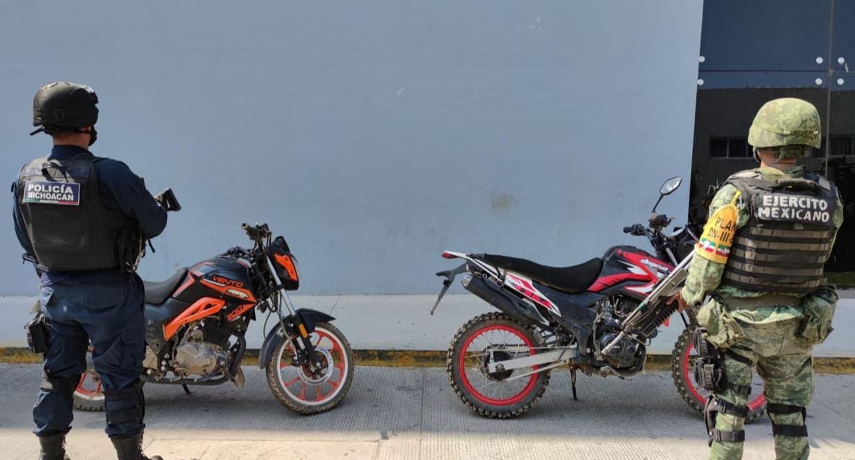 Al efectuar recorridos para la disuasión del delito en la localidad de Patambam, personal de la Policía Michoacán, Ejército Mexicano y GN, aseguró a dos menores de edad, quienes tripulaban dos motociclistas de las marcas Italika y Vento, respectivamente, con reporte de robo, localizándoles además, las mencionadas drogas.