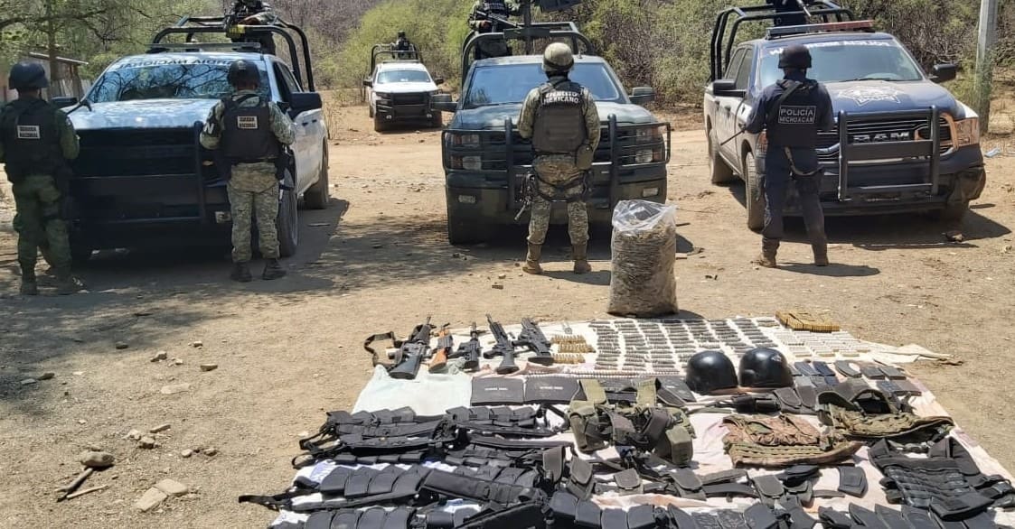 Elementos de la Policía Michoacán, en conjunto con el Ejército Mexicano y la Guardia Nacional, efectuaban trabajos en la localidad de Zacanguierete, sitio donde aseguraron cinco fusiles de diversos calibres, así como mil 764 cartuchos útiles y una bolsa que contenía hierba color verde con las características propias de la marihuana.