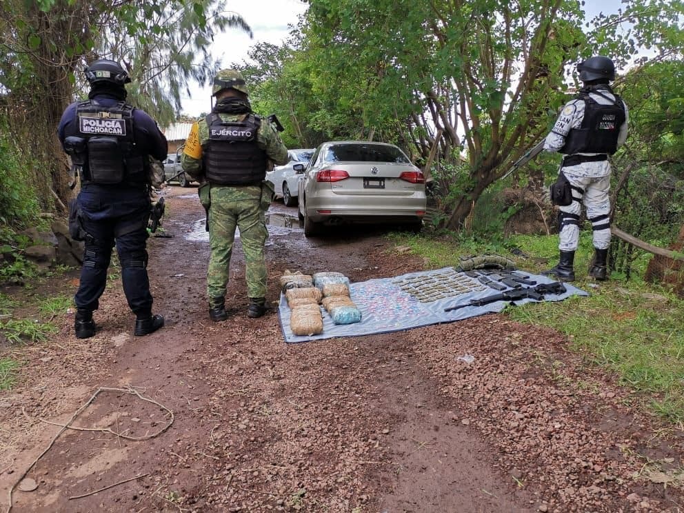 Jacona, Michoacán, a 25 de julio de 2021.- Una acción conjunta llevada a cabo entre elementos de las secretarías de Seguridad Pública (SSP), de la Defensa Nacional (SEDENA), así como de la Guardia Nacional (GN), permitió el aseguramiento de dos automotores, en cuyo interior fueron encontrados un fusil, 400 cartuchos útiles, 11 cargadores, 9.25 kilogramos de hierba color verde con las características de la marihuana, así como 200 envoltorios con una sustancia granulada, al parecer metanfetamina.
