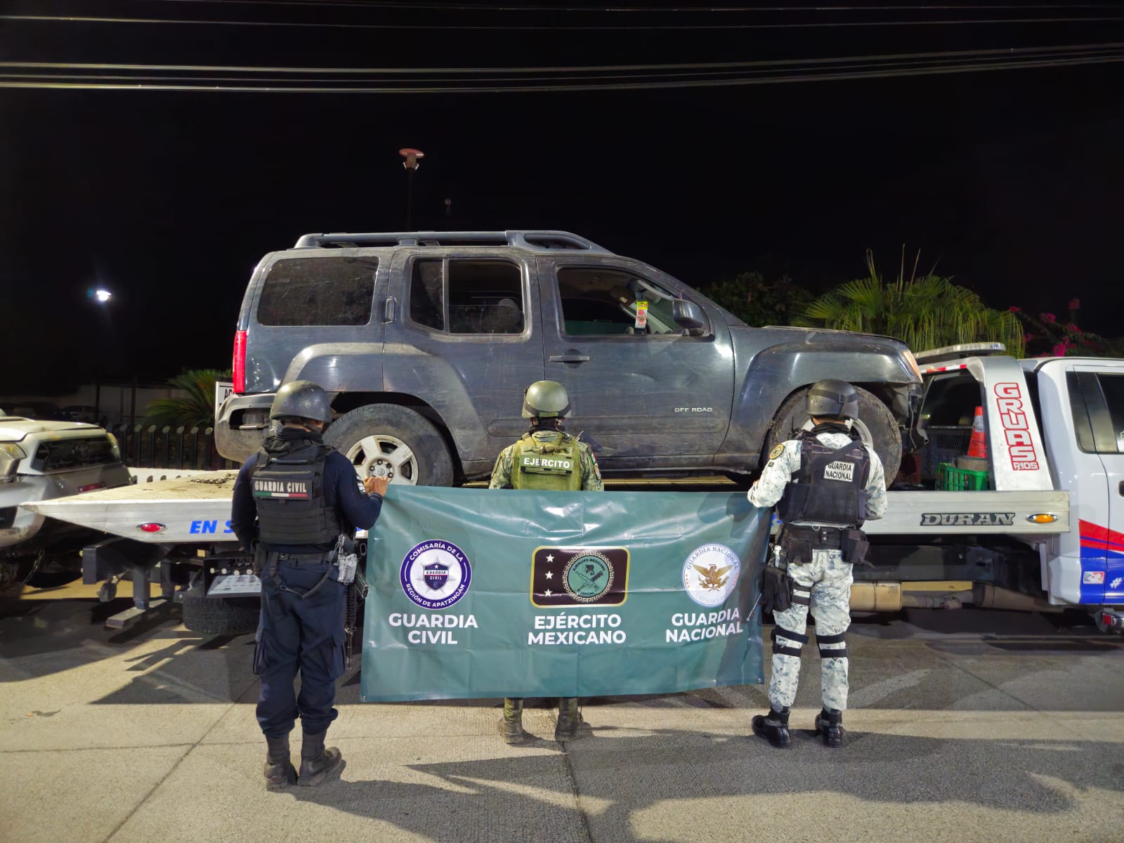 En una primera acción, durante patrullajes de reconocimiento en la localidad de Santa Ana Amatlán, agentes de la Guardia Civil, del Ejército Mexicano y de la GN localizaron un RZR marca Polaris con reporte de robo, así como un arma larga calibre 5.56×45 milímetros, 60 municiones, cargadores y equipo táctico.