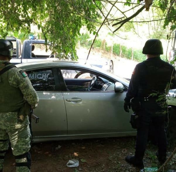 Durante tareas de seguridad por personal de la Policía Michoacán, así como de la GN en la carretera Arteaga-Lázaro Cárdenas, se ubicó un vehículo de la marca Mazda en aparente estado de abandono, procediendo a llevar a cabo una inspección.