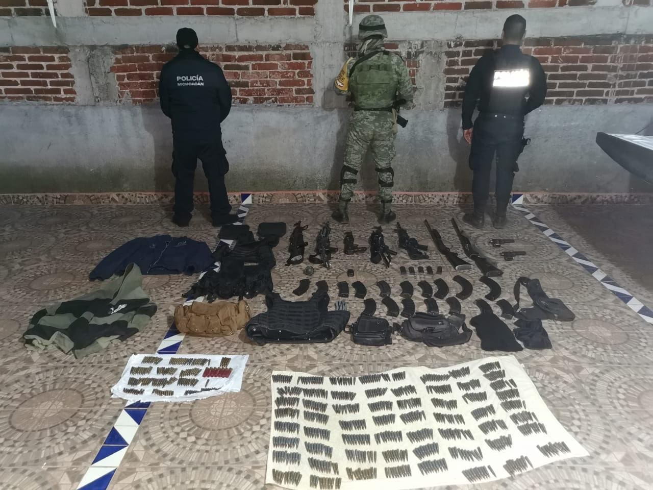 De igual forma, se ubicaron 730 cartuchos útiles, 24 cargadores, una granada de fragmentación, así como equipo táctico.