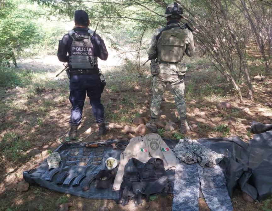 Al efectuar acciones de vigilancia sobre una brecha que conduce a la localidad El Mango, personal de la Policía Michoacán y del Ejército Mexicano localizó en un predio un arma de fuego calibre 7.62X39, por lo que realizó un perímetro de seguridad en la zona.