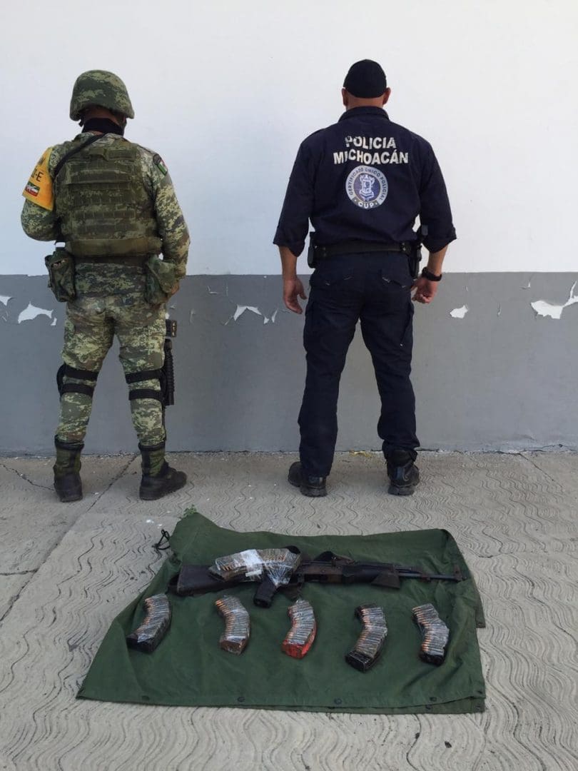 Durante recorridos para la disuasión en una zona serrana en las cercanías de la localidad El Aguaje, personal de la Policía Michoacán y del Ejército Mexicano localizó un arma de fuego calibre 7.62X39, así como 120 cartuchos útiles y seis cargadores del mismo calibre.